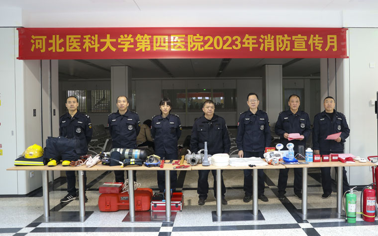 保卫处在门诊楼大厅开展消防宣传月活动,副院长赵群、保卫处处长姚川及院区义务消防员参加。