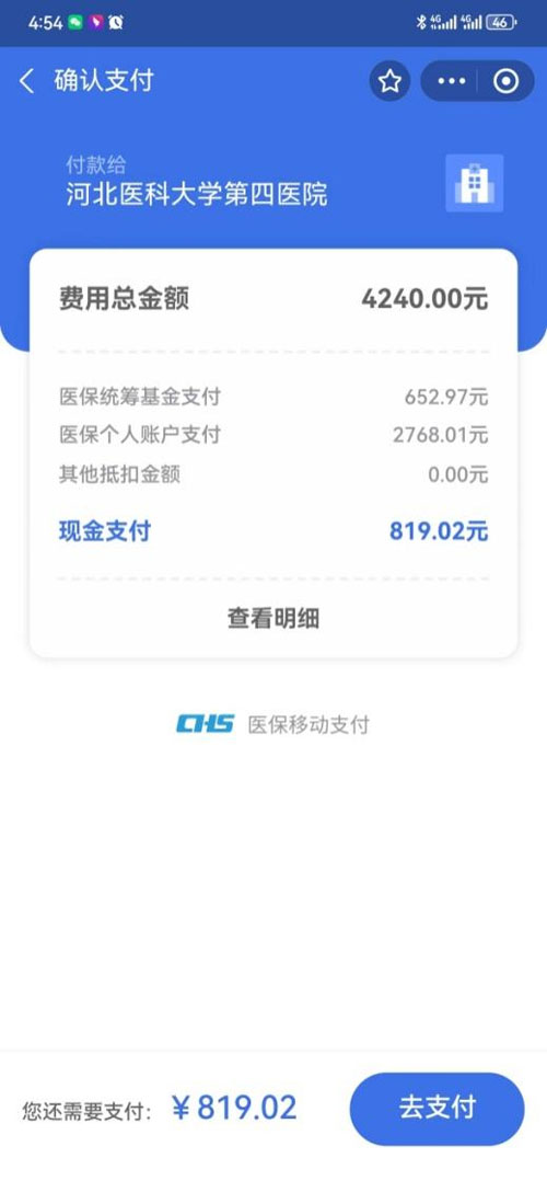 确认费用,选择“医保支付”后,系统就会自动跳转至医保电子凭证授权界面,授权后展示医保报销金额,点击支付后即可完成支付。