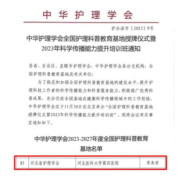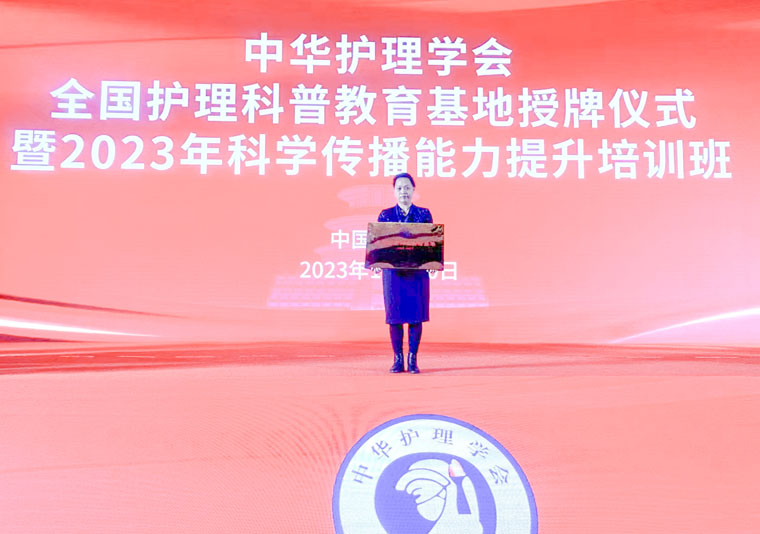 11月30日,中华护理学会在北京举行全国护理科普教育基地授牌仪式暨2023年科学传播能力提升培训班,我院成功获批“全国护理科普教育基地”。