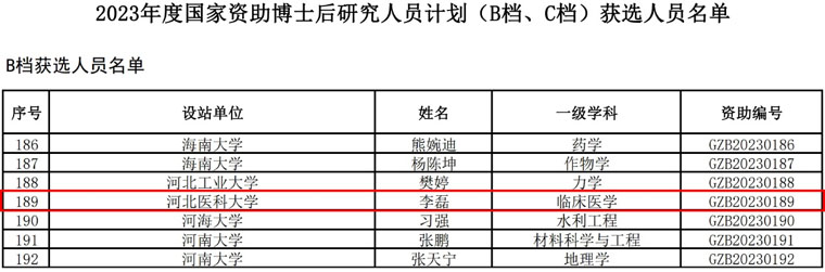 科研中心李磊博士后为河北医科大学唯一获得B档资助人员,其合作导师为单保恩教授。据悉,本次共确定4617名获选人员,河北医科大学有2位博士后获得资助。李磊博士后的入选标志着果冻传媒