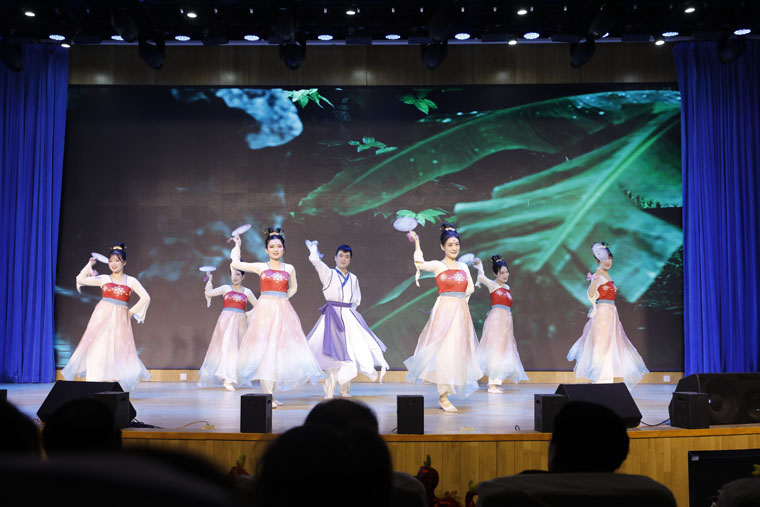 联欢会在离退休党总支合唱的《祖国,慈祥的母亲》中拉开帷幕。击鼓表演《吉祥天鼓》振奋人心。整场晚会以历程为轴,分为使命、奋斗、发展和未来四个篇章,将医院的时光画卷与全新蓝图徐徐铺展。第一章“使命篇”,舞蹈《盛世鸿姿》、独唱《有我》、快板《医院颂》、舞蹈《再唱山歌给党听》、表现了四院人的自豪感、使命感和跟党走的决心。第二章“奋斗篇”,舞蹈串烧《青春绽放》活力四射;省抗癌协会康复会医患共同表演手语《你鼓舞了我》情暖人心;小品《外卖囧事》从一名外卖员的视角展示了医务工作者的辛劳;歌伴舞《万疆》勾勒山河无恙的盛世景象,祝福我们的祖国万寿无疆。第三章“创新篇”,古风舞蹈《同簪》温婉优雅,古韵绵长;创意三句半轻松幽默,令人捧腹;舞蹈《达坂城的姑娘》舞姿优美;情景剧《平凡母亲的华丽蜕变》表现了果冻传媒