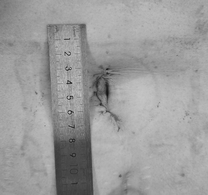 经充分讨论,手术团队决定采用国产蛇形臂单孔手术机器人系统对患者进行手术。术中采取绕脐4cm小切口,在单孔下利用1个镜头及3个机械臂对胃肿物充分的游离,进行局部切除,最大限度有效保留正常胃壁,提高患者生活质量。由于慢性炎症,患者胆囊周围黏连严重,胆囊壁水肿增厚,增加了手术难度。利用蛇形手术臂兼顾力负载和灵活性的特点,术者既能牵拉腾挪,又能全周向弯转,精准、稳定地完成胆囊切除。手术操作仅用时2个半小时,术中出血约5ml。