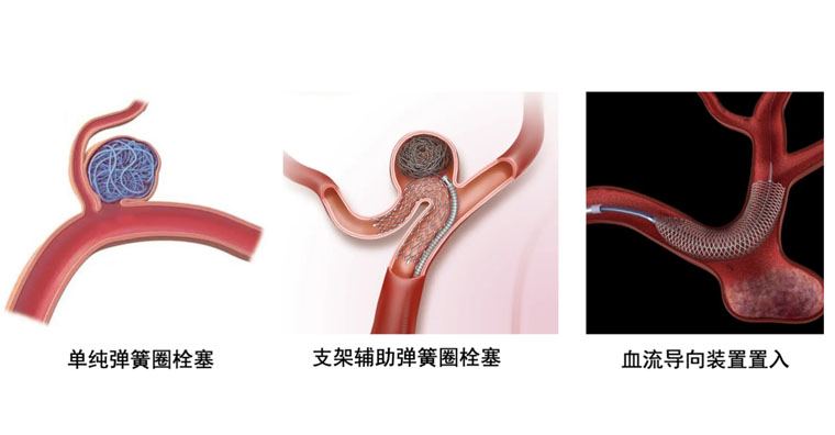 介入治疗:方式包括单纯弹簧圈栓塞、支架/球囊辅助弹簧圈栓塞、血流导向装置置入以及覆膜支架置入。随着医学介入科技的进步和国家医保政策的进一步完善,介入治疗以其微创性和无神经功能损伤的优势成为越来越多临床医师和患者治疗动脉瘤的优先选择。