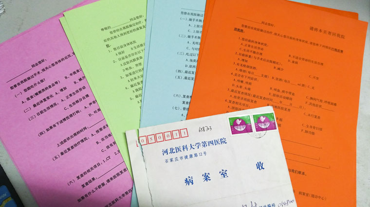 出院患者随访主要采用信访方式,很多患者随访跟踪达30-40年。随访卡片清晰记录了患者的住院号、姓名、性别、年龄、单位、住址、出院诊断、手术日期、手术方式、治疗效果、生存情况、生存年限、联系人姓名及方式、回访日期及结果。