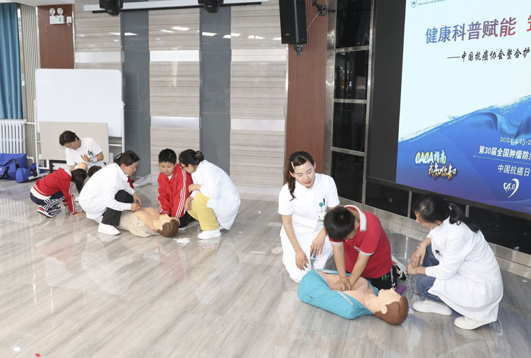 儿科护士胡亚美为大家演示了常用的心肺复苏和海姆立克急救技术,并现场指导孩子们利用模拟人等教具进行实操体验,引导同学们加强尊重生命、正确保护生命安全的意识。现场气氛热烈,孩子们争先恐后地实操演练,护理专家还特意准备了爱心贴纸作为鼓励。