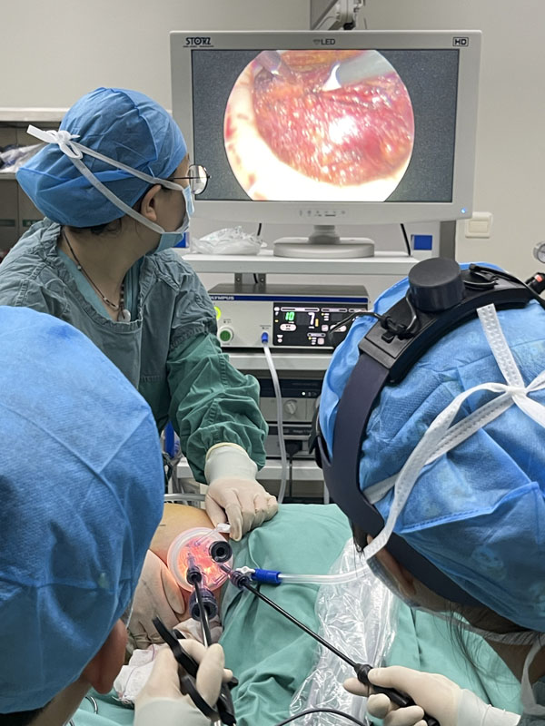 手术当日,乳腺中心团队为患者实施腔镜下乳房切除+前哨淋巴结活检+I期乳房重建术(假体+带蒂背阔肌肌瓣胸肌前置入)。术中需要将背阔肌肌瓣游离,从背部转移至胸前,为假体重建乳房提供一个健康的软组织层。腔镜下分离、切取背阔肌肌瓣的手术方式,能够精准切取背阔肌的同时免除背部切口,降低了切口感染延迟愈合的风险,真正实现了微创的目的。术后,王建新护士长带领护理团队给予患者精心照护和康复指导。