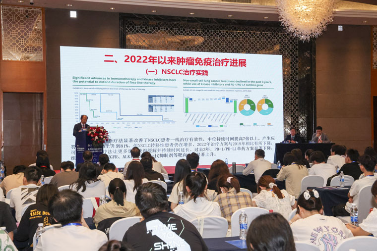 在该方面的研究进展;中国中医科学院广安门医院李杰教授分享了《中西医结合防治肿瘤原创理论构建及循证评价》,阐述了中西医结合在肿瘤诊治方面的传承与创新;天津医科大学总医院陈军教授带来了《肺肉瘤样癌(PSC)研究现状及进展》,对当前该领域的临床特征、分子特征等研究成果及未来方向进行讲解。