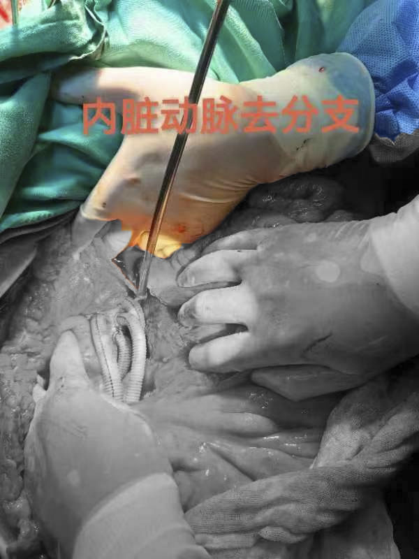 心外科负责人赵永波主刀,龚琪副主任医师、要凯主治医师、李超主治医师共同参与,术中夹层动脉瘤与周围组织粘连严重,可能出现大出血危及生命。手术团队运用高超娴熟的技巧,密切配合、攻克难关,顺利完成开放手术腹主动脉置换及腹腔脏器血管重建,随后进行腔内修复手术。该手术充分展现了果冻传媒