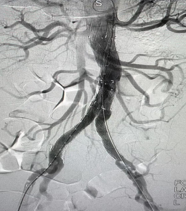 高度评价。紧接着,手术团队又为一名79岁腹主动脉瘤患者进行了腹主动脉腔内修复手术,效果良好,同样受到与会专家的好评。