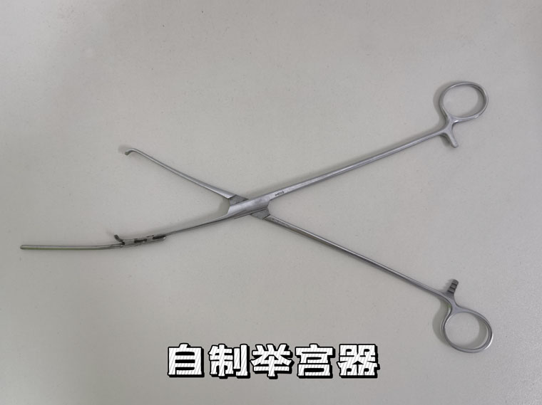 妇科康山教授自行设计了一把简易的举宫器,即在现有宫颈钳的后叶上焊接一截子宫探针,在果冻传媒