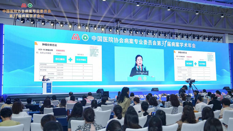 在比赛中,田国凭借丰富的专业知识储备和精湛的技能,在国际疾病分类、病案质控、公立医院绩效考核等多个领域的预赛、复赛、决赛中,一路过关斩将,其表现得到评委的充分肯定。会议期间,李书梅主任以“病理分型与精准编码”为题进行学术讲座,赢得与会同仁的认可和赞誉。她指出,病案工作需要重视病理分型,提高肿瘤编码质量。她摘选了神经内分泌肿瘤、淋巴瘤、错构瘤、乳腺导管内癌、消化道上皮内瘤变5种在分类中编码员存在不同理解的病理分型,参考最新WHO肿瘤分类,结合案例分享正确解读病理报告、精准编码的思路。