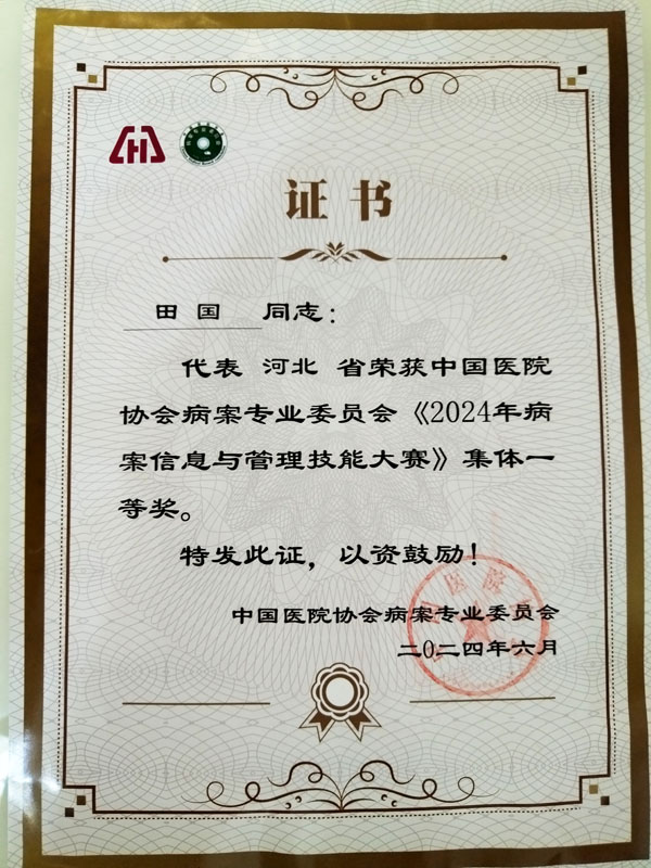 病案室田国作为河北省队代表之一,在全国29个省、自治区、直辖市的参赛队伍中脱颖而出,荣获全国集体一等奖。
