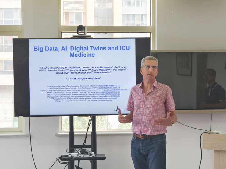 蔡斯教授以《Big Data,AI,Digital Twins》(《大数据、人工智能、数字孪生》)为题,为重症医学科的医护人员、在读硕博研究生带来学术分享,周聪教授担任同声翻译。蔡斯教授阐述了当前重症医学领域面临的挑战以及大数据和人工智能在其中的应用前景,条理清晰、案例生动,在场每一位听众都深受启发。大家踊跃发言,提出了在重症医学、大数据和人工智能相关领域遇到的问题和疑惑,蔡斯教授以独到的见解和丰富的经验,提供了建议和指导。