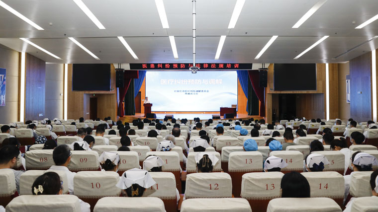 在新医技病房楼报告厅举行“医疗纠纷预防与调解”和“新版病历书写的法律风险防范”专题培训,特邀石家庄市医疗纠纷调解委员会曹藏虎主任和河北国桥事务所王国军律师进行授课。会议由彭利副院长主持,东院区同步视频。