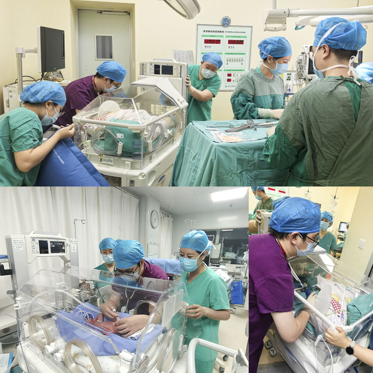 产妇既往有晚期流产史,现无子女,本人及其家属对此次成功妊娠非常期待。经与对方充分沟通,东院产科决定行紧急剖宫产娩出胎儿。凌晨3时,麻醉科、儿科做好应急准备,产科团队专注手术操作,东院儿科病区主任沈颖和贺世超医生做好新生儿急救准备,麻醉科邱东洁和康金梦医生确保产妇安全并准备新生儿气管插管,手术室齐乘客、柴金龙护士确保手术器械齐全,经多学科团队不懈努力,手术顺利结束,体重仅1120g的极早产儿平安降生。