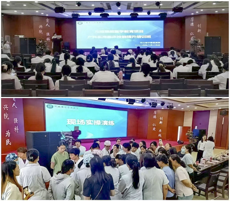 近日,东院产科杨志芬副主任及团队应邀前往宁晋县,以理论授课联合实操演练的形式开展了一场深入的产科临床技能培训。作为东院产科“适宜技术推广”的第四站,此次培训专注于提高当地医务人员处理严重产后出血、预防DIC和会阴裂伤缝合等关键技能。宁晋县各医疗单位百余名产科骨干医护人员参加培训。宁晋县医院院长温志谦在开幕式上致辞,产科主任张丽霞主持活动。