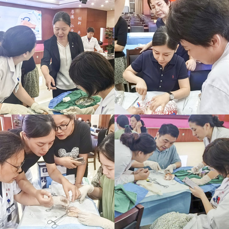 在实操演练环节中,杨志芬副主任和王胜普医师通过使用子宫模型和尿管代球囊等模拟工具,对产科手术止血技术要点进行全面讲解,在子宫模型上展示了B-Lynch缝合、Hayman垂直压缩缝合、CHO缝合、子宫动脉结扎等手术标准化操作示范。路月梅主任医师和秦玉珍医师通过亲手制作会阴裂伤动物模型,演示了缝合技巧并强调缝合过程中的关键注意事项和处理原则。随后,参训人员分组进行了实际操作练习,确保每位医护人员都能掌握这些关键技术。学员们纷纷表示,“省四院专家带来了规范化、系统化的理论知识与技术操作,非常实用,有利于帮助我们将所学知识应用于实际工作中。”