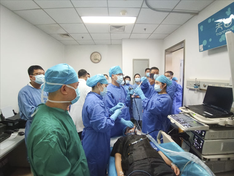 胸科内镜室进行,胸外科二病区王淼副主任医师、三病区王哲主治医师、六病区李志锋主治医师与麻醉一科胡涛副主任医师配合,共进行4台全麻EBUS手术演示,一病区翁晨刚主治医师进行常规气管镜诊疗的现场演示。大家在现场深入交流,胸科内镜室全员倾囊相授,得到与会人员的一致好评,“能在现场参观这样专业的手术演示,对我们是一段非常宝贵的学习经历”。
