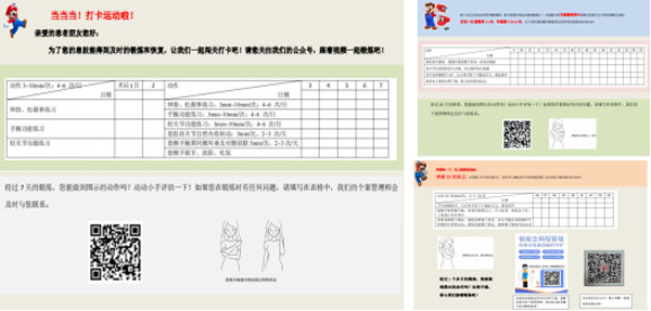 患者出院后,乳腺中心的院外延续护理服务不仅关注患者的身体康复,更着眼于全方位的长期健康管理。为更好地支持乳腺癌患者在院外的康复过程,乳腺中心提出了一系列创新的观点和举措。患者出院时,采用卡通闯关模式,设计个体化患肢功能锻炼日志卡,起到时时提醒监督作用,保证锻炼质量。日志卡将锻炼内容进行量化,方便患者掌握锻炼的强度,及时明确患肢功能恢复情况。个案管理师在患者出院后1周内、1月、3月、半年、1年进行定期随访,分析评估患者阶段性达标状况,切实解决实际困难。个案管理师管案1年后予以结案,将患者转介至乳腺中心随访室,由专业随访人员进行定期随访,最终实现患者全程、全方位管理。