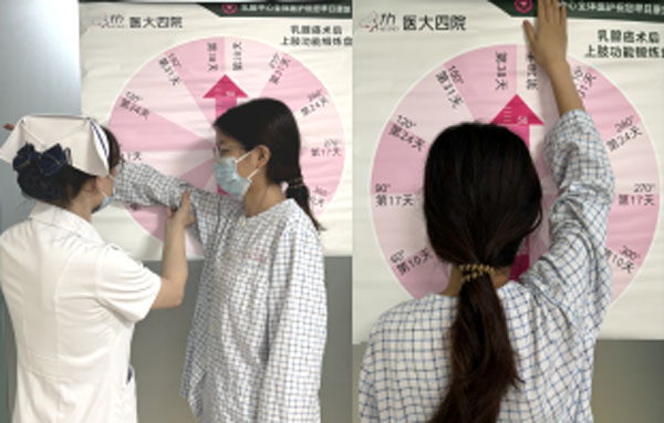 乳腺中心积极响应国家号召,持续推进“改善就医感受、提升患者体验”专项工作。科室针对乳腺疾病慢病管理现状,以乳腺癌患肢功能康复为支点,循证护理理论为指导,聚焦乳腺癌患肢(因手术等因素影响肢体活动,称为“患肢”)功能锻炼的细节管理与实施,开展多专业护理联动。目前形成了“三固定、两灵活”的管理模式,建立了院前、院内、院外一体化诊疗、护理、随访流程,致力于让患者就医的每一个环节更有温度。