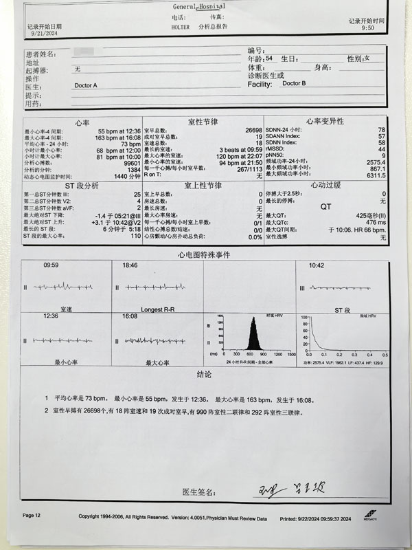 心血管内科。患者12导联心电图示,“窦性心律,频发室性期前收缩”;心脏彩超提示,“检查过程中可见频发期前收缩,二尖瓣轻度关闭不全”;24小时动态心电图示,“最大心率为163次/分,室性早搏26698个,有18阵室速和19次成对室早,有990阵室性二联律和292阵室性三联律”。