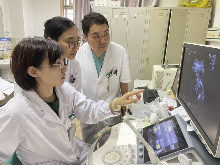 东院产科负责人杨志芬和路月梅副主任陪同薛女士进行全面检查。超声科王礼贤副主任在检查后发现胎盘覆盖宫颈口并侵及膀胱,植入评分高达13分,情况极为严重。CT磁共振科许茜主任医师通过MRI分析进一步确认了这一严重性,预示分娩时可能面临大出血、子宫切除甚至威胁生命的情况。