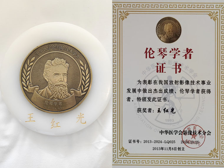 放射科王红光主任技师荣获“伦琴学者”奖及荣誉称号。据悉,中华医学会影像技术分会于2013年11月8日创立了“伦琴学者”奖及荣誉称号,是该分会的最高学术奖,每4年评选一次,以表彰在我国放射医学影像技术事业发展中做出卓越成绩和突出贡献的影像技术专家。(威廉·康拉德·伦琴是德国物理学家,1895年发现了X射线。1901年,首届诺贝尔物理学奖授予了他,以表彰他为开创医疗影像技术做出的巨大贡献。)