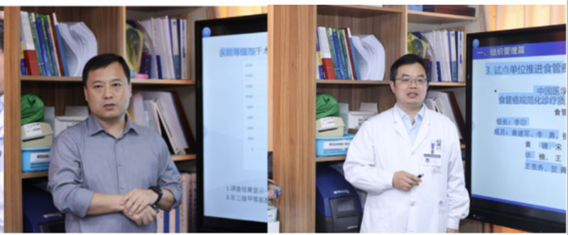 胸外科吕会来医生和中国医学科学院肿瘤医院张瑞祥医生分别就各自的研究成果和质控建设中的实践经验进行汇报。吕会来介绍了食管癌规范诊疗质量控制的流程和节点医院建设的情况,为实现质控标准化提供了经验。随后,会议进入专家问答与讨论环节,来自北京、天津、吉林、辽宁、哈尔滨、山西等多位知名专家学者组成的专家组,就食管癌规范化诊疗流程、质控要点、疑难病例处理等问题进行深入探讨和交流。