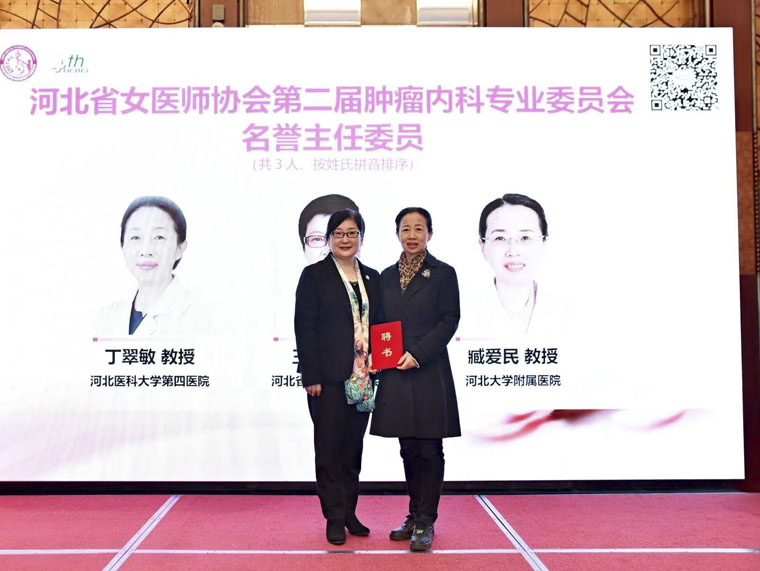 丁翠敏教授、河北省人民医院王娟教授、河北大学附属医院臧爱民教授担任省女医师协会肿瘤内科专委会名誉主任委员;唐山市人民医院董桂兰教授、河北省人民医院李庆霞教授、承德医学院附属医院吕喜英教授及河北大学附属医院商琰红教授当选省女医师协会肿瘤内科专委会第二届副主任委员。