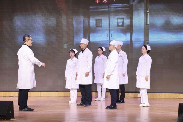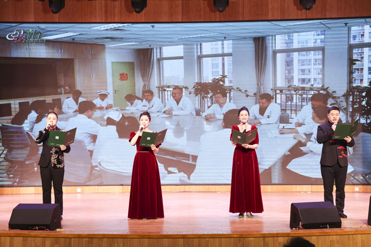 随着离退休党总支激昂的大合唱《祝福祖国》音乐响起,演出正式拉开帷幕。整场联欢会巧妙构思,分为上下两个篇章,形式丰富,亮点频现。上篇以“勇担使命 砥砺奋发”为主题展开:歌伴舞《美丽中国年》生动诠释了新春的欢腾喜悦;四重唱《春风十万里》旋律悠扬,传递春天的希望与温暖;心外科负责人赵永波以《心怀感恩,与爱同行》为主旨,通过深情真挚的讲述,展现了一名外科医生的担当和医患间的温暖,令人动容;豫剧《朝阳沟选段》经典再现,彰显传统文化魅力;歌伴舞《如愿》深情表达了爱与希望;情景剧《跨越四十年的就医之旅》细腻刻画了“医”路传承和医患间的紧密联系,突显了胸外科手术技术四十载的飞跃式发展。