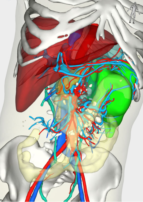 术前,针对肿瘤的特殊性以及与周围脏器、血管的复杂关系,在于滨主任的主持下,外二科本部与东院区医务人员深入研究病情,同时邀请麻醉科、ICU、CT磁共振科、介入中心、泌尿外科、肝胆外科、胸外科等相关科室进行多学科讨论,制定了周密的手术方案,旨在确保肿瘤完整切除,同时最大限度避免术中出血。按照多学科讨论意见,术前在介入中心对患者肿瘤主要供血血管进行了栓塞处理。