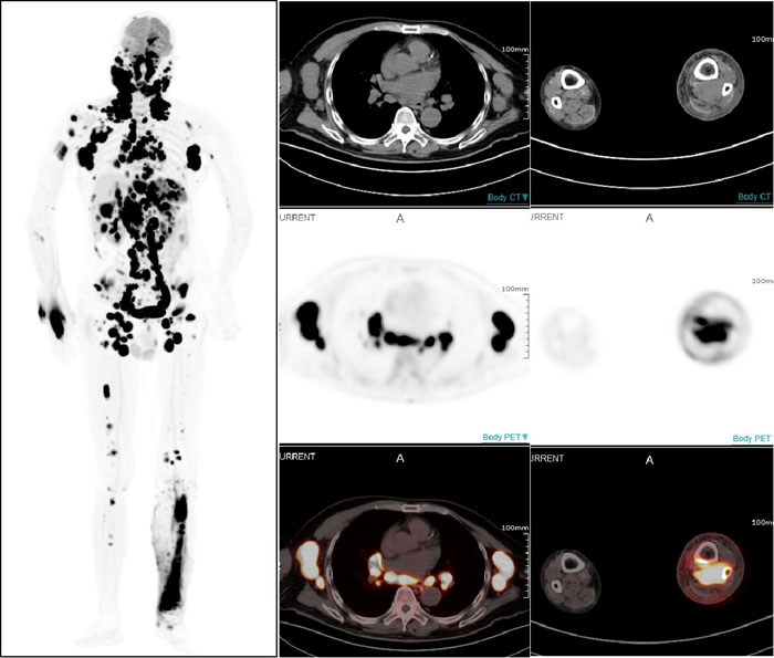 PET/CT显示:全身多部位淋巴结和多个结外器官及不易发现的左小腿后方肌肉组织淋巴瘤受累病灶