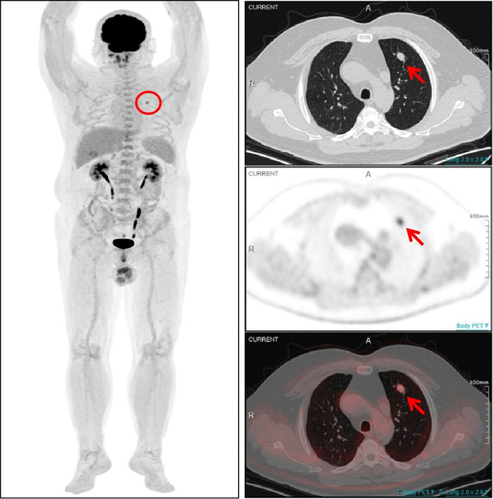 一名54岁男性患者曾在1年半前接受了左大腿脂肪肉瘤切除术,术后规律复查。一次常规CT检查发现其左肺上叶存在一个软组织结节,随后复查显示该结节有所增大,直径约为1.0cm。面对这一疑似转移的挑战,全景动态Total-body PET/CT 清晰显示左肺上叶结节伴明显异常葡萄糖高代谢,提示该结节为肺转移灶。基于检查结果,医生能够及时为患者制定更加个体化的治疗方案。对该患者的诊断,彰显了全景动态Total-body PET/CT 在癌症诊断领域的非凡实力。