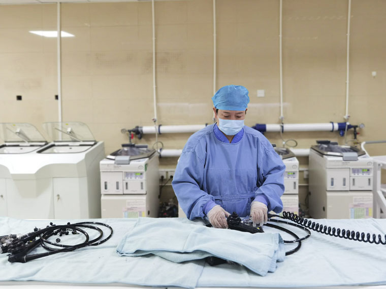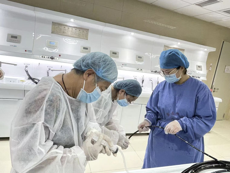 “请问内镜检查会感染传染病吗?消毒彻底吗?”这是很多患者就诊前普遍考虑的问题。“蓝”护士承担着内镜再处理工作,从预处理开始到干燥结束,洗消过程繁杂,晨消工作检查胃肠镜上洗消机,每天的诊疗结束后,再将内镜全部干燥送进储镜室,保证每条内镜必须满足储存的标准。