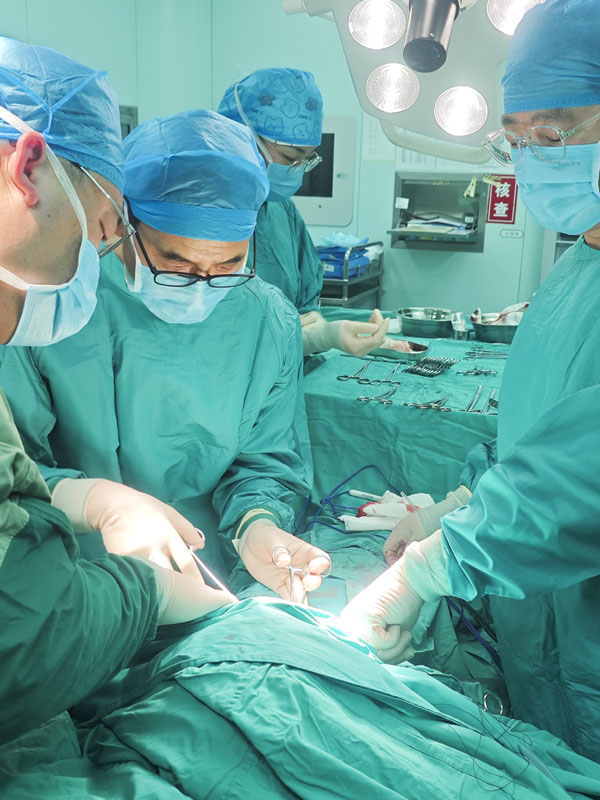 入院时,患者的气管自甲状软骨完全离断,周围组织气肿明显、组织结构混乱模糊。急诊科首先接诊了患者,很快完成了气管插管,保证了呼吸道的通畅。但是,钝性损伤导致的气管离断和切割伤不同,现有的医疗技术不足以精确评估气管损伤的波及范围。“我来做!”面对病情的复杂性和发展的不确定性,陈新主任医师果断担起治疗重担,经无影灯下的快速会诊,患者的损伤情况逐渐清晰:气管自第二软骨一下完全离断,向胸腔回缩,左侧喉返神经断裂,右侧喉返神经损伤,食管壁完整,血管完整。在耳鼻喉科王占龙主任医师协助游离喉部后,陈新主任医师进行了支气管重建,手术顺利完成。