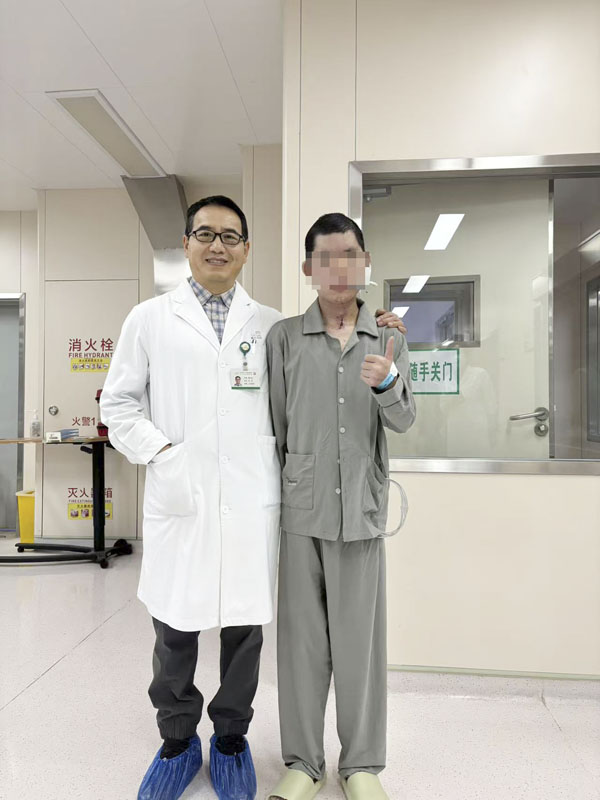 胸五科陈新主任医师带领团队为患者进行了气管重建手术。之后,患者转入ICU病区,在ICU、胸外科、耳鼻喉科等相关科室的通力协作下,克服了肺炎、营养衰竭等难关,终于脱离呼吸机拔管、下床活动,伤后50天,顺利转至康复机构进行后续恢复。