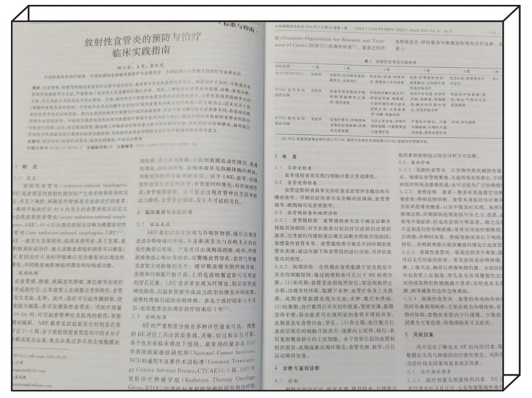 放疗科杨从容副教授执笔,放疗科王军教授、中国科学技术大学附属第一医院袁双虎教授共同担任通讯作者的论文《放射性食管炎的预防与治疗临床实践指南》位列其中。