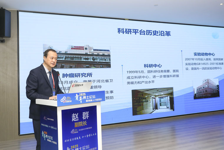 副院长赵群介绍了医院科研共享平台。他表示,河北省肿瘤研究所设于院内,医院拥有国内先进的科研中心、实验动物中心,9个省级重点实验室,3个省级临床研究中心,以及国际科技合作基地等。平台汇聚大量科研人才,承担众多科研课题,成果显著。希望青年博士借助这些优势资源,在科研道路上取得更多创新成果。