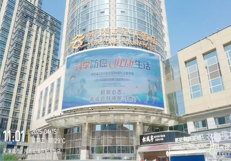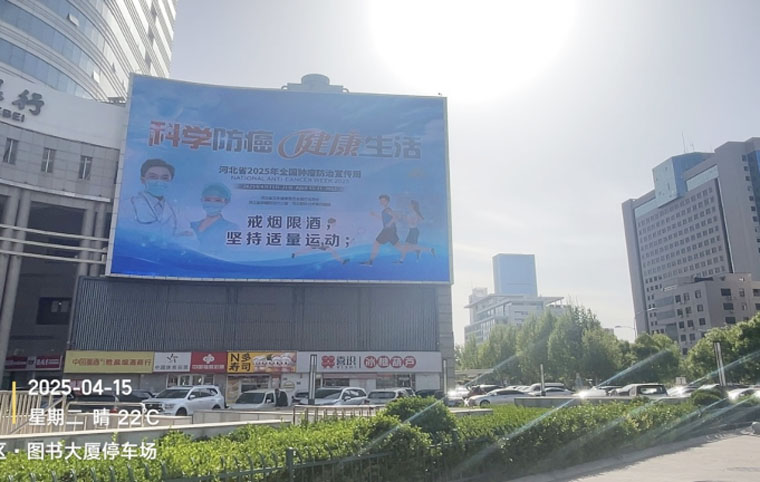 4月15-21日,在石家庄市地标位置的户外大屏同步高频循环播放以“科学防癌,健康生活”为主题的肿瘤防治宣传视频,同时,在医院门诊大屏滚动播放“科学防癌,健康生活”主题相关宣传内容。