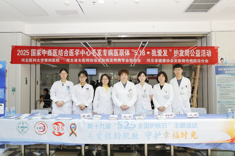 皮肤科在本部门诊大厅举办了毛发专病医联体 “518我爱发” 护发周公益活动及第十九届 “525全国护肤日” 主题活动。今年“525全国护肤日” 的宣传主题为“关爱银龄肌肤,守护幸福时光” 。皮肤科主任张燕带领医护团队,为前来咨询的患者提供了专业、贴心的义诊健康服务。