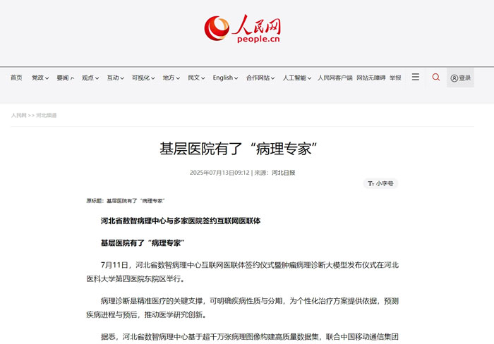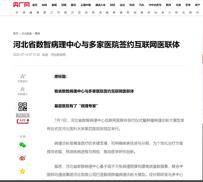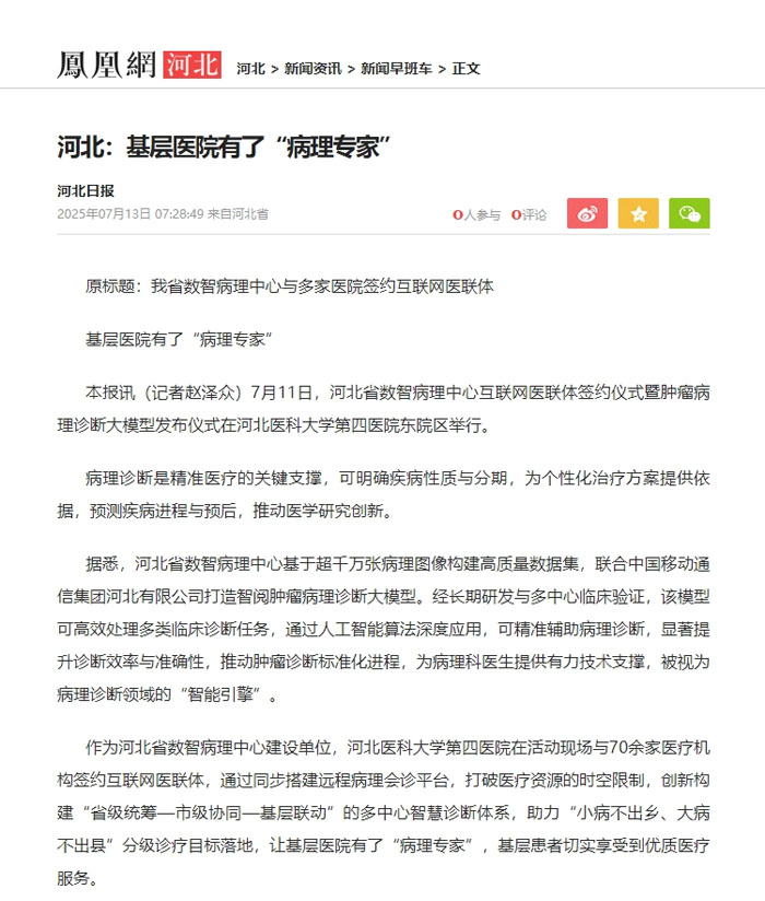 东院区举行。此次活动标志着我省病理诊断领域向智能化、精准化迈进重要一步。活动受到国内省内主流媒体高度关注,央广网、人民网、河北日报、河北广播电视台、石家庄广播电视台等多家平台对仪式进程进行了报道。