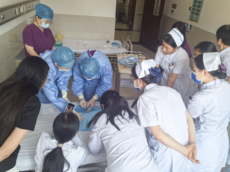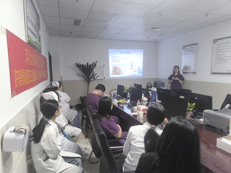 在新生儿救治领域的主要技术、新生儿脐静脉置管术的应用进展;张文浩主治医师讲解了脐静脉置管的技术要点;王瑛玮护士长分享了脐静脉置管“细节决定成败”的护理经验;许彦平主管护师针对无创辅助通气操作流程进行细致剖析。实践操作环节,儿科团队进行了规范化现场模拟操作演示,手把手教学,从器械准备、穿刺技巧到固定方法,每一个步骤均进行了细致示范与讲解,确保参训医护人员精准掌握技术要点。针对操作过程中可能出现的问题,现场同步进行答疑解惑。专家团队还针对该院新购置的呼吸机进行了个性化指导。
