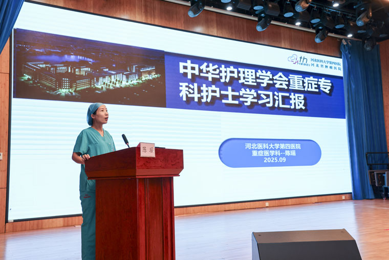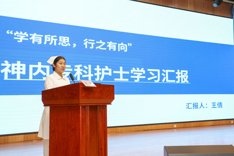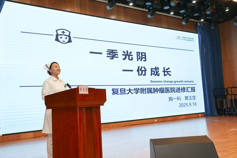 随后,12名外派护理骨干依次进行汇报,涵盖在复旦大学附属肿瘤医院、华西医院、邵逸夫医院等机构进修或参加专科护士培训期间的学习内容、专业技能提升情况、前沿护理理念吸收成果,以及结合岗位实际形成的改进项目方案等。