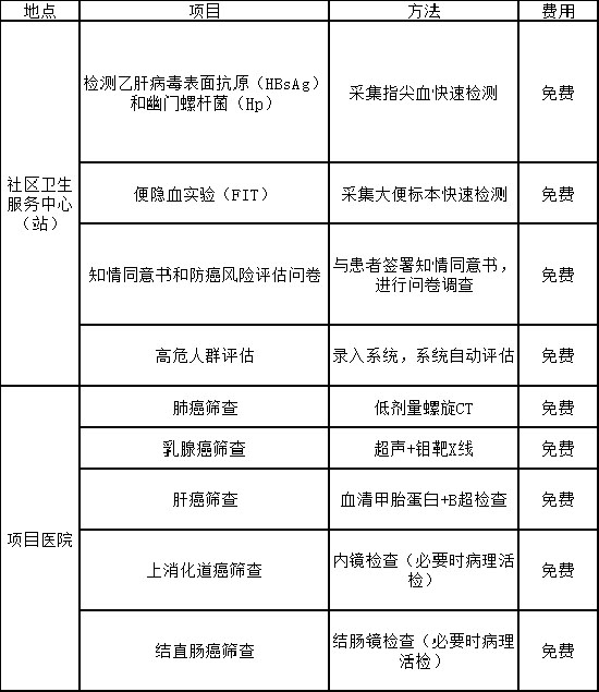 该项目旨在通过规范的癌症风险评估、临床筛查和随访干预,实现对肺癌、乳腺癌、结直肠癌、上消化道癌和肝癌等常见癌症的早期发现、早期诊断和早期治疗。项目共分为三阶段,第一阶段是问卷调查与高危人群评估,居民在社区通过一对一、面对面进行问卷信息填写以及高危人群评估,评估出相关癌症的高危人群。第二阶段为临床筛查阶段,主要是以各地市定点筛查医院为基础开展工作,评估出来的各个癌种高危人群进行相应的筛查,即肺癌高危人群通过低剂量螺旋CT筛查、乳腺癌高危人群通过乳腺超声和钼靶筛查、结直肠癌高危人群通过肠镜进行筛查、上消化道癌高危人群通过上消化道内镜进行筛查、肝癌高危人群通过甲胎蛋白检测和肝脏超声筛查。第三阶段为随访和卫生经济学评估,对所有筛查出来的阳性患者进行定期的主动及被动随访。