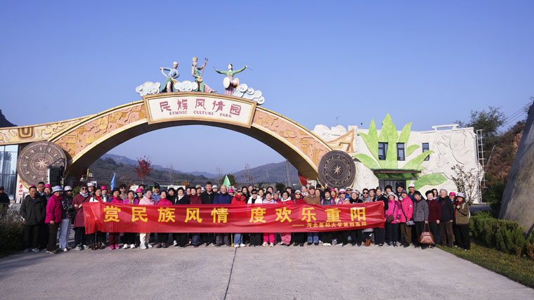 当日,阳光明媚,秋风送爽。老同志们怀着愉快的心情来到平山民族风情园。景区连山绝壁、绿水轻舟、花海飘香,古树奇石形态各异,可以领略到各个少数民族的独特建筑风貌。老同志们边参观边交流,共同追忆往昔岁月,在欢声笑语中感受自然之美,纷纷拍照留念,记录下这难忘的时刻。返程途中,大家仍意犹未尽地分享着收获与感受,表示此次重阳节游园活动不仅领略了民族风情与自然之美,更真切感受到了四院“大家庭”的温暖与关怀。