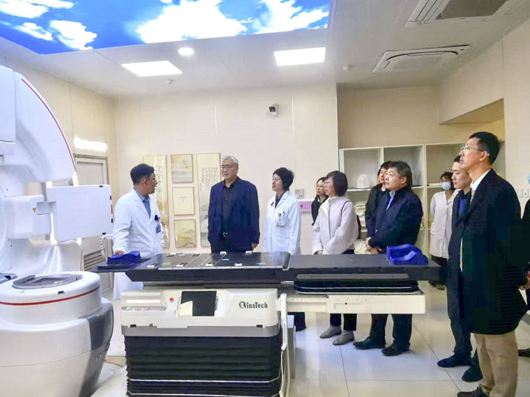 放疗科主任王军,胸部放疗二病区主任王澜,胸部放疗五病区主任周志国,放疗技术组主任迟子锋、副主任张若辉、技师长苗明昌、物理室组长尚凯等全程陪同参观交流。