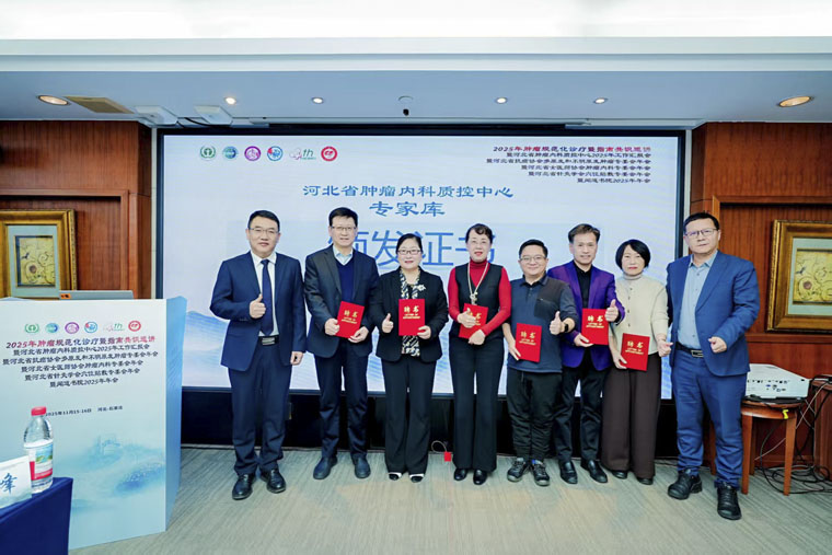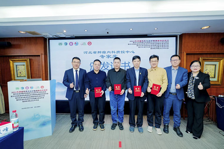 随后,常务副院长何宏涛和北京大学第一医院吴世凯教授共同向胸外科、普外科、肝胆胰外科、介入科、放疗科和肿瘤内科等领域的河北省肿瘤内科质控中心专家库成员颁发证书。