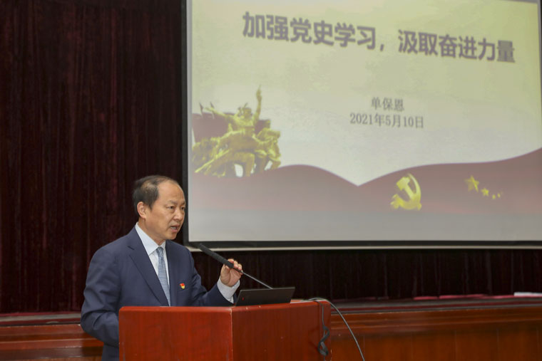 今年是建党一百周年。单保恩书记以《加强党史学习 汲取奋进力量》为题,以党的十九次全国代表大会的召开为主线,用详实的史料和丰富的内容为支撑,充分运用唯物史观,围绕党的理想信念、道路选择、重大转折等方面,全面回顾了中国共产党在新民主主义革命时期、社会主义革命和建设时期、改革开放和社会主义现代化建设时期、中国特色社会主义建设时期的历史,对中国共产党百年艰辛的奋斗历史进行了深入浅出的讲解和阐释,进一步引导广大党员干部职工充分认识了中国共产党为什么“能”、马克思主义为什么“行”以及中国特色社会主义为什么“好”。