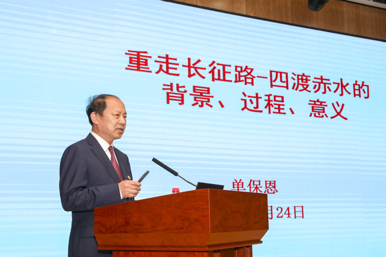 单保恩书记以《重走长征路——四渡赤水的背景、过程、意义》为题,从为什么要长征、遵义会议、四渡赤水、从红军长征精神学领导力四个方面带领大家重温并学习了这一波澜壮阔的伟大历程。他指出,中国工农红军从1935年1月19日离开遵义到5月9日全军渡过金沙江的3个多月时间里,走了110个城镇。毛泽东依据战场实际,时而向北摆出同红四方面军会师的态势,时而又回头显露出要与红二、红六军团会合的趋向,机敏地调动敌人,在赤水河两岸与强敌周旋。四渡赤水时红军失去根据地且无后方依托,中央红军只有3万余人,而国民党部队是40万。面对十多倍国民党军的围追堵截,红军充分发挥灵活机动的游击战术,歼敌18000人,俘敌3600多人,取得了红军长征史上以少胜多的第一个重大胜利,是变被动为主动的光辉战例,是红军战争史上的奇观,保存了中央红军的有生力量,进一步巩固了毛泽东在党和红军中的领导地位。