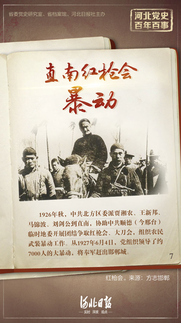 在北伐战争大好形势的影响下,1926年秋,中共北方区委派贾湘农、王新邦、马锦波、刘剑公到直南,协助中共顺德(今邢台)临时地委开展团结争取红枪会、大刀会,组织农民武装暴动工作。在贾湘农和刘剑公负责的“冀南农民运动办事处”领导下,从1927年5月至6月,红枪会、大刀会先后攻克了南和、肥乡、曲周、巨鹿、任县、广宗、邢台等县城,并在巨鹿建立了临时机构。6月4日,党组织领导了成安、肥乡和邯郸东南乡的红枪会、天门会和黄沙会约7000人的大暴动,将奉军赶出邯郸城。